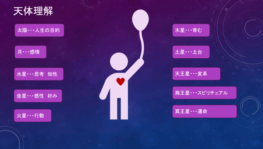 ◆10天体と12サインがわかり、宇宙の流れや魂の成長ストーリが理解できます。